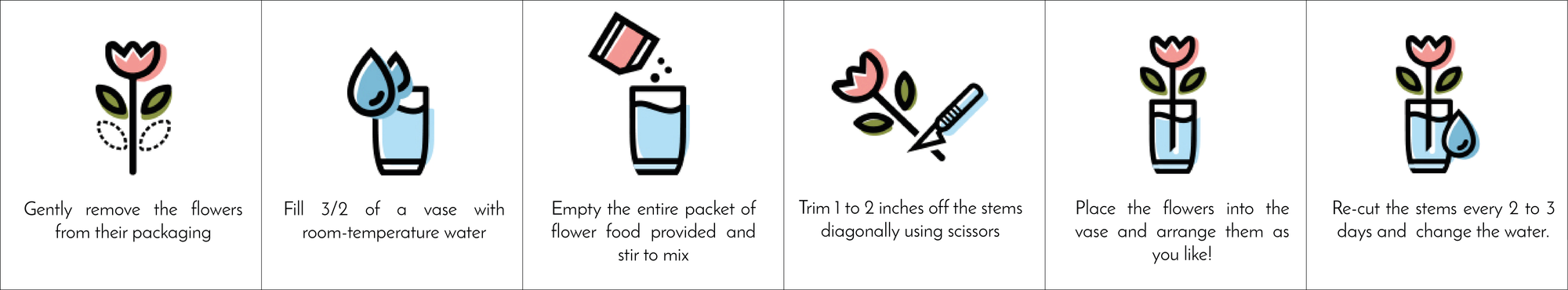 Flowers are a living piece of nature and require some essential hygiene practices to improve their vase life. We recommend the following generally, however, each species andtheir varieties often have individual requirements.