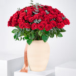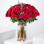 Immerse yourself in the breathtaking beauty of our Grandeur Red Roses Vase Arrangement. Featuring 100 large-headed red roses, elegantly complemented by lush greenery, this stunning display is the epitome of luxury and romance. Perfect for making a grand statement on any occasion