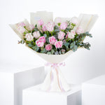 A beautiful hand-tied bouquet of 25 pink roses, representing admiration and grace. The perfect anniversary gift to convey love, appreciation, and timeless elegance.