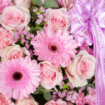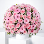 This stunning floral arrangement, nestled in a hatbox, features a lovely blend of pink roses, gerberas, carnations, and rose candy pink, accented with Statice Pink. A perfect choice for anniversary occasions, weddings, or any special event, offering a touch of elegance and sophistication.