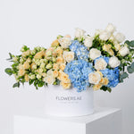 A delicate selection of premium blue hydrangeas, white roses, white spray roses and spray roses selenora, complimented with Eucalyptus leaves elegantly arranged in our signature hatbox.