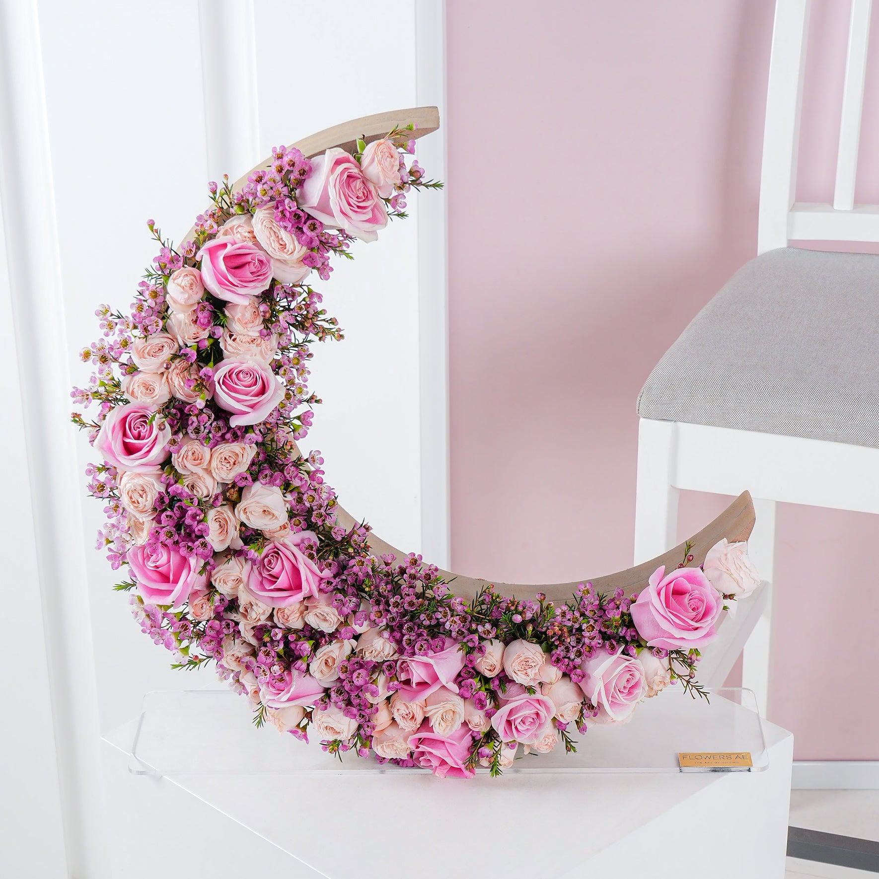 Celebrate the spirit of Ramadan with our exquisite crescent flower arrangement. This stunning arrangement embodies the essence of the holy month, symbolizing renewal, beauty and blessings. Crafted with care and precision, each flower represents hope, love, and devotion, creating a captivating centerpiece that illuminates any space with its soft hues and elegant design. Embrace the warmth and tranquility of Ramadan with this enchanting floral masterpiece, a perfect addition to your festive gatherings and sacred moments of reflection.