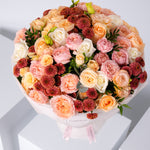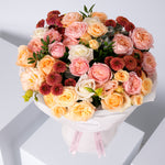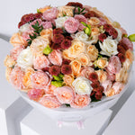 A graceful blend of soft whites, peach tones, and warm autumn textures, this bouquet pairs roses, lisianthus, and chrysanthemums with gentle foliage and seasonal leaves for a look that’s as comforting as the season