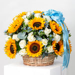 A soft yet striking palette of white roses, sunny sunflowers, and blue oxypetalum, thoughtfully styled in a classic hatbox. A fresh summer expression for new beginnings, congratulations, or just because.