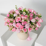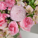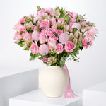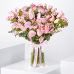 Celebrate their special day with this exquisite arrangement of vibrant pink carnations, delicate alstroemeria, fuchsia roses, and soft pink ping pong chrysanthemums. A radiant blend of color and texture, perfect for making birthdays extra memorable.