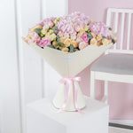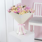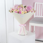 Soft, joyful, and full of heart—this pink-toned arrangement combines pink hydrangeas, pink roses, and spray roses, accented with eucalyptus leaves. A lovely way to celebrate meaningful accomplishments with a fresh and feminine touch.