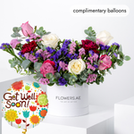 Featuring deep purple roses, white roses, pink and purple statice, purple carnations, eucalyptus and pistacia leaves. A thoughtful and calming get-well gift that includes a complimentary Get Well Soon Balloon.