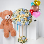 Welcome a new baby with a delicate stand arrangement of premium blue hydrangeas, white roses, and Selenora spray roses, accented with fresh eucalyptus.