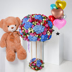 Celebrate a new baby with a delicate stand arrangement of blue hydrangeas, purple roses, and red and white spray roses, accented with fresh eucalyptus.
