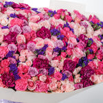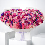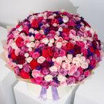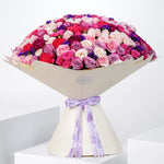 Our luxurious Arianna arrangement features Spray Rose Bombastic, Statice Purple, Fuchsia and Purple Carnations, Purple Spray Rose, Fuchsia Rose, and Deep Purple Rose, elegantly wrapped in our signature Grand style. Perfect for any occasion, this exquisite bouquet exudes sophistication and leaves a lasting impression