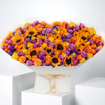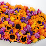 Featuring vibrant sunflowers, orange and yellow roses, deep purple roses, fuchsia and purple carnations, pink and purple statice, and eucalyptus and pistach leaves. It's the perfect gift for any occasion!