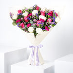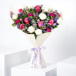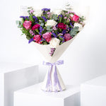 Experience pure luxury with our Lavender Floral, expertly crafted by top florists. This regal arrangement features Deep Purple Roses, White Rose Vendela, Statice Purple, and Eucalyptus in soothing purple hues, exuding elegance and sophistication.