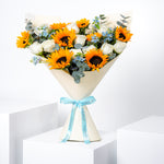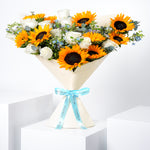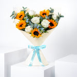 A fresh and vibrant mix of white roses, sunny sunflowers, and soft blue oxypetalum—this hand-tied bouquet captures the breezy spirit of summer skies. A perfect gift for new beginnings, warm wishes, or just because.