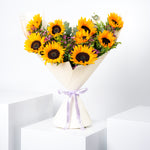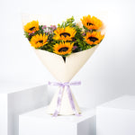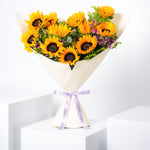 A cheerful burst of sunshine, this hand-tied bouquet features radiant sunflowers, golden solidago, and delicate purple wax flowers. Bursting with texture and warmth, it's the perfect pick-me-up for life’s little wins or simply brightening someone’s day.