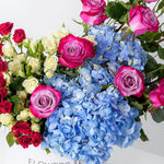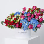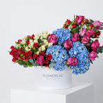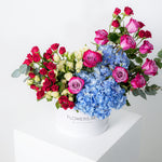 A delicate selection of blue hydrangeas, purple roses, red and white spray roses, complimented with Eucalyptus leaves elegantly arranged in our signature hatbox.
