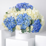 A combination of gorgeous white roses, white hydrangeas, blue hydrangeas and white wax complemented by Eucalyptus greens in a hatbox will make the perfect gift to welcome a baby boy.