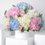 A gorgeous mix of pink, white and blue Hydrangeas with