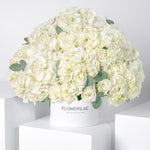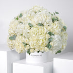 A combination of gorgeous white roses, white hydrangeas and white wax complemented by Eucalyptus greens in a pot will make the perfect gift to welcome a baby boy.