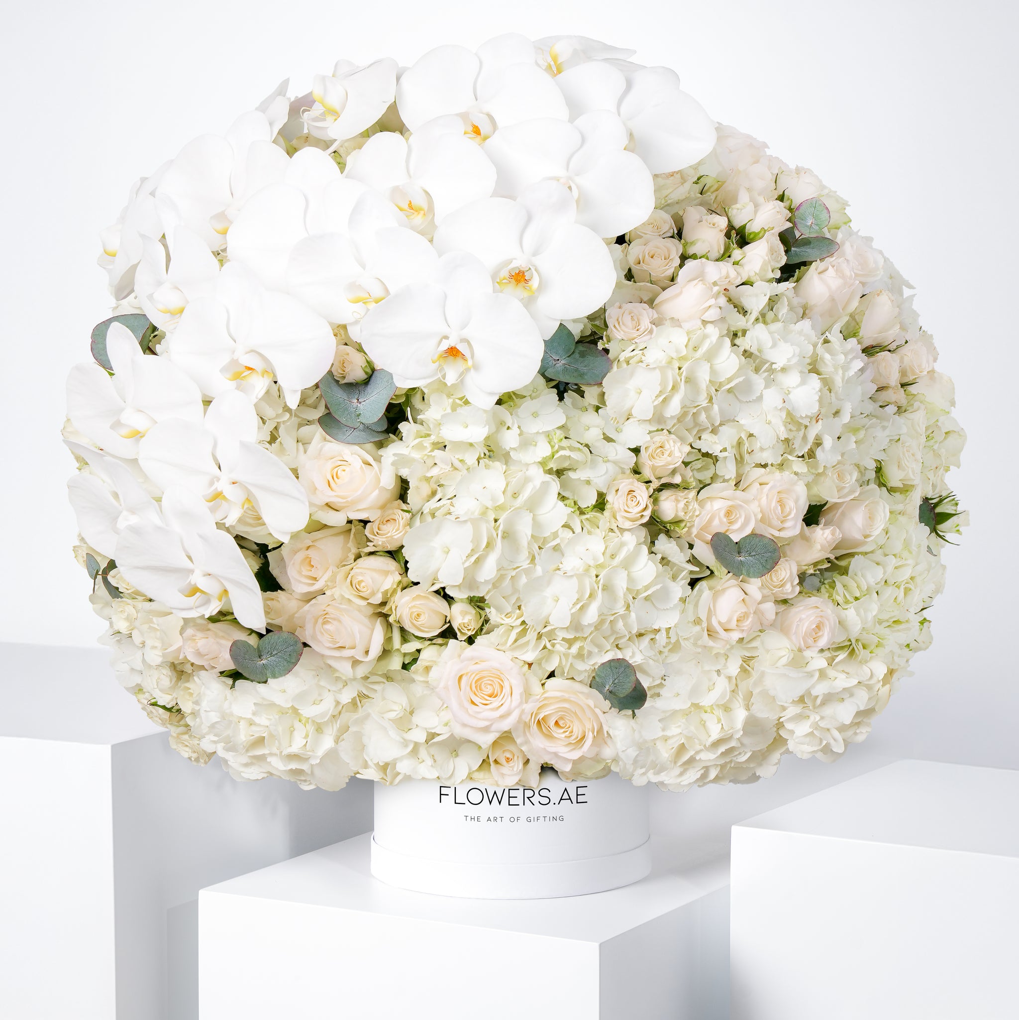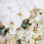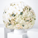 Featuring layers of white roses, lush hydrangeas, and elegant orchids, Juliette is finished with eucalyptus for a soft, refined touch. A timeless arrangement that celebrates grace and luxury.