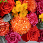 Full of personality and charm, this hatbox arrangement is an energetic mix of bold tones and rich textures. Featuring cheerful yellow freesia, bright chrysanthemums, striking fuchsia and orange roses, and lush red hydrangeas, it’s a joyful statement piece that brings warmth, color, and happiness to any celebration.