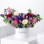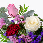 Featuring deep purple roses, white roses, pink and purple statice, purple carnations, eucalyptus and pistacia leaves, it's the perfect gift for any occasion!