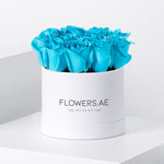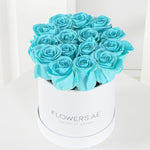 Our Tiffany Blue Roses in a Petite Hatbox exude elegance and charm. Hand-dyed for a unique touch, these blooms symbolize tranquility and admiration, making them a perfect gift for any occasion.