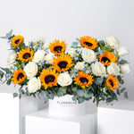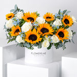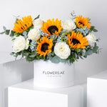 A soft yet striking palette of white roses, sunny sunflowers, and blue oxypetalum, thoughtfully styled in a classic hatbox. A fresh summer expression for new beginnings, congratulations, or just because.