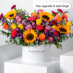A radiant hatbox overflowing with vivid sunflowers, roses, carnations, and statice, styled with eucalyptus and pistach leaves. Bold and colorful, it’s a statement gift for life’s brightest celebrations.