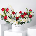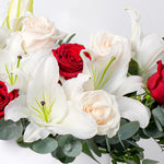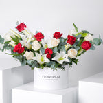 A striking hatbox arrangement of white lilies and white and red roses, artfully accented with eucalyptus. Elegant and fragrant, it’s a beautiful way to make a lasting impression.