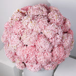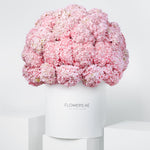Elegant pink hydrangeas presented in a tall hatbox for a luxurious statement that radiates femininity and charm.