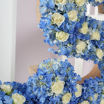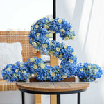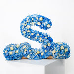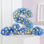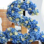 Our 40cm standing wooden letter arrangement features beautiful blue hydrangeas and white spray roses, creating a stunning and unique display for any occasion.