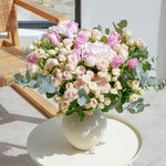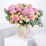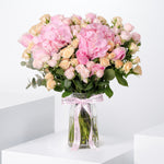 A delicate selection of pink hydrangeas, pink roses and spray roses, complimented with Eucalyptus leaves.