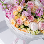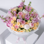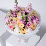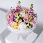 A sweet and delicate blend of blush tones, this bouquet is a dreamy mix of pink and white peonies, soft carnations, creamy and peachy roses, and fragrant matthiola. With its gentle palette and airy textures, it feels like a fresh scoop of elegance perfect for gifting.