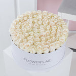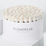 Impress your loved one with an XXL hatbox of white roses, a luxurious and unforgettable gift that symbolizes love and affection.