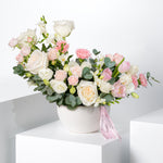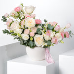 Delicate, dreamy, and effortlessly elegant, this soft-toned arrangement features pastel tulips, pale pink carnations, and soft roses. Accented with white freesia and lisianthus, it’s a graceful bouquet perfect for moments that call for a gentle and romantic gesture.