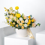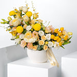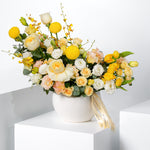 Inspired by the golden glow of early morning light, this warm and radiant arrangement features cheerful yellow tulips, sunny ping pong chrysanthemums, and soft peach lisianthus. With touches of oncidium and buttery-hued roses, it’s the perfect way to brighten someone’s day.