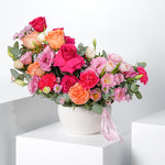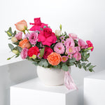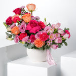 A joyful celebration of bold colors, this lively arrangement bursts with personality. Featuring bright pink tulips, vivid carnations, and lush pink lisianthus, it’s paired with striking roses and soft lavender-hued chrysanthemums. Designed to energize and delight this bouquet brings a pop of happines