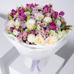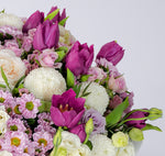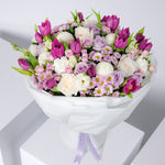 A soft and elegant blend of lilac and ivory tones, this arrangement brings a sense of graceful charm. Featuring elegant purple tulips, creamy white and soft lilac roses, it’s accented with airy white carnations, white ping pong blooms, and lavender-hued chrysanthemums. Perfect for moments that call for something subtle yet striking.