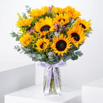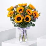 A cheerful burst of sunshine, this vase arrangement brings together radiant sunflowers, golden solidago, and delicate purple wax flowers. Designed to brighten any room, it’s a joyful touch of nature perfect for any day.