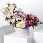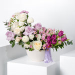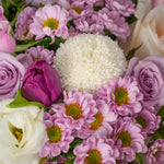 A soft and elegant blend of lilac and ivory tones, this arrangement brings a sense of graceful charm. Featuring elegant purple tulips, creamy white and soft lilac roses, it’s accented with airy white carnations, white ping pong blooms, and lavender-hued chrysanthemums. Perfect for moments that call for something subtle yet striking.