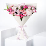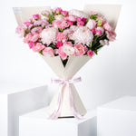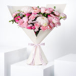 A fresh and feminine bouquet full of charm. This hand-tied mix combines candy pink roses, blush carnations, and lisianthus, with soft pink chrysanthemums adding texture. Wrapped in signature style with pistache and eucalyptus for a natural flourish.