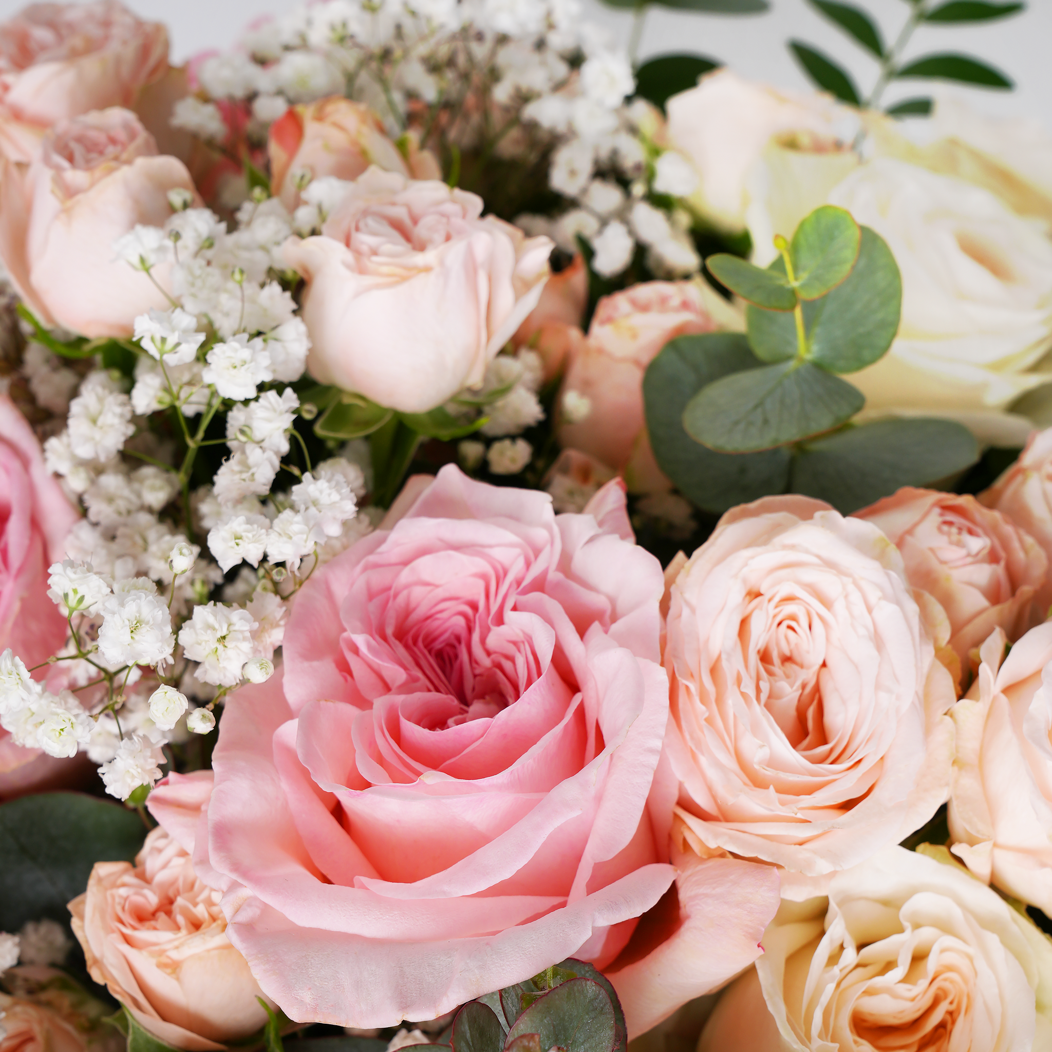 Perfect for Ramadan and Eid gifting, this charming hand-tied bouquet features spray rose bombastic alongside rose o’hara pink and white, and delicate gypsophila. Accented with pistache and eucalyptus, it is a graceful floral gesture designed to elevate cherished moments.