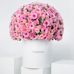 A luxurious flower arrangement in our signature tall white hatbox, featuring pink roses, Gerberas, carnations, statice, and eucalyptus. Elegant and charming, it's perfect for any occasion and sure to impress.