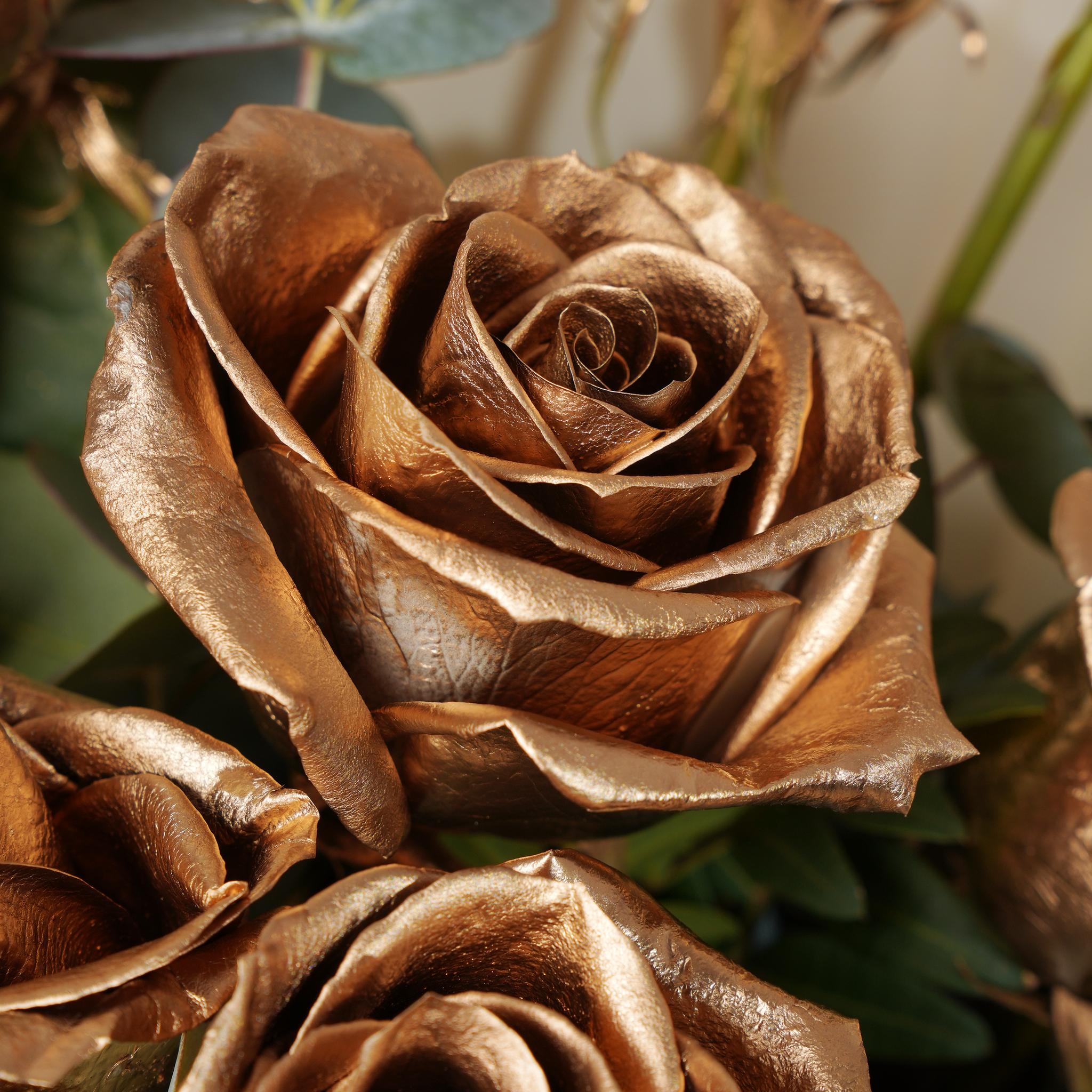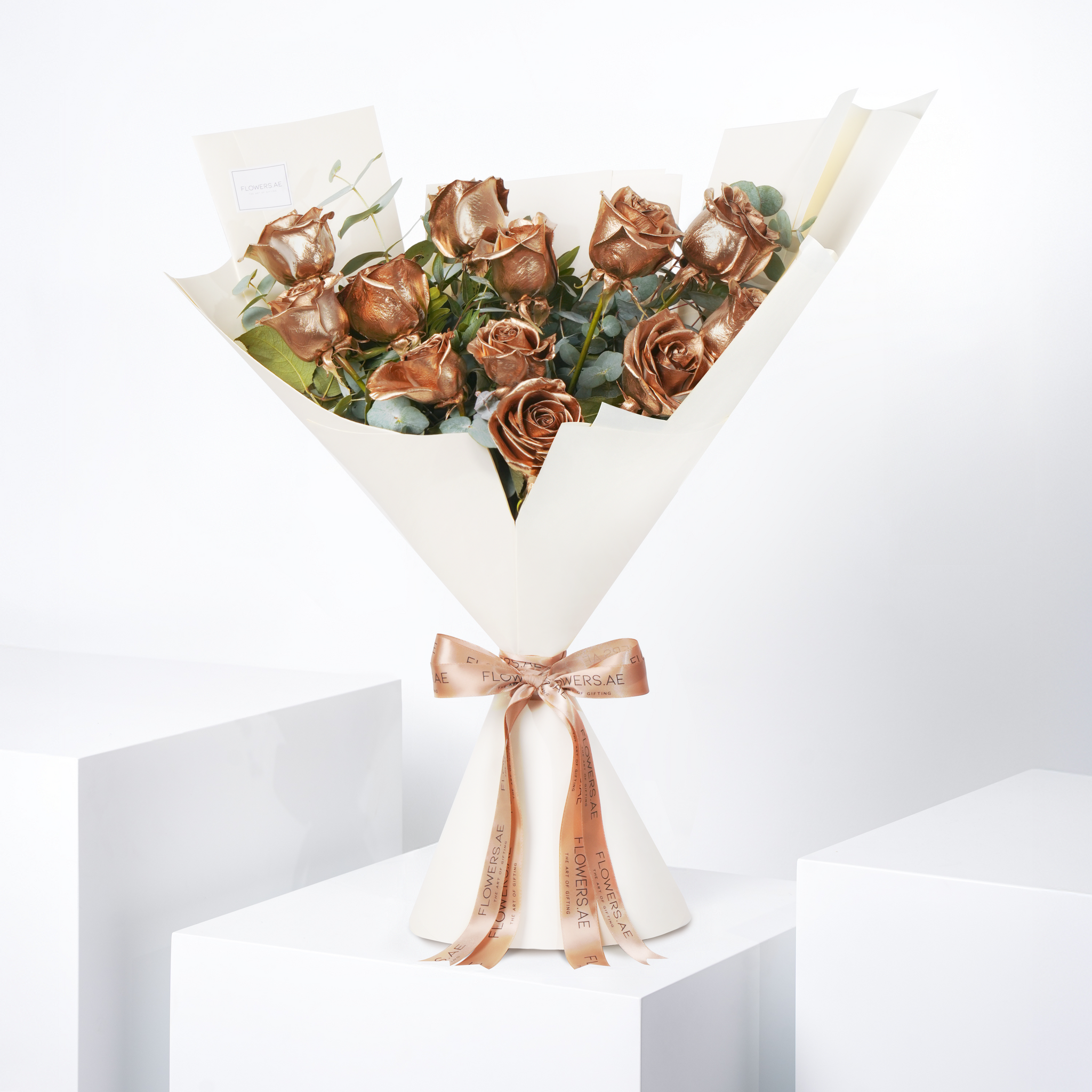 A stunning bouquet of 12 hand-tied gold roses, beautifully arranged with fresh greenery. The perfect gift to make a bold statement of luxury and unforgettable style.