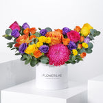 A joyful burst of roses, chrysanthemums, lisianthus, and eucalyptus in a chic petite hatbox. The vibrant colors make it the perfect gift to brighten any occasion.