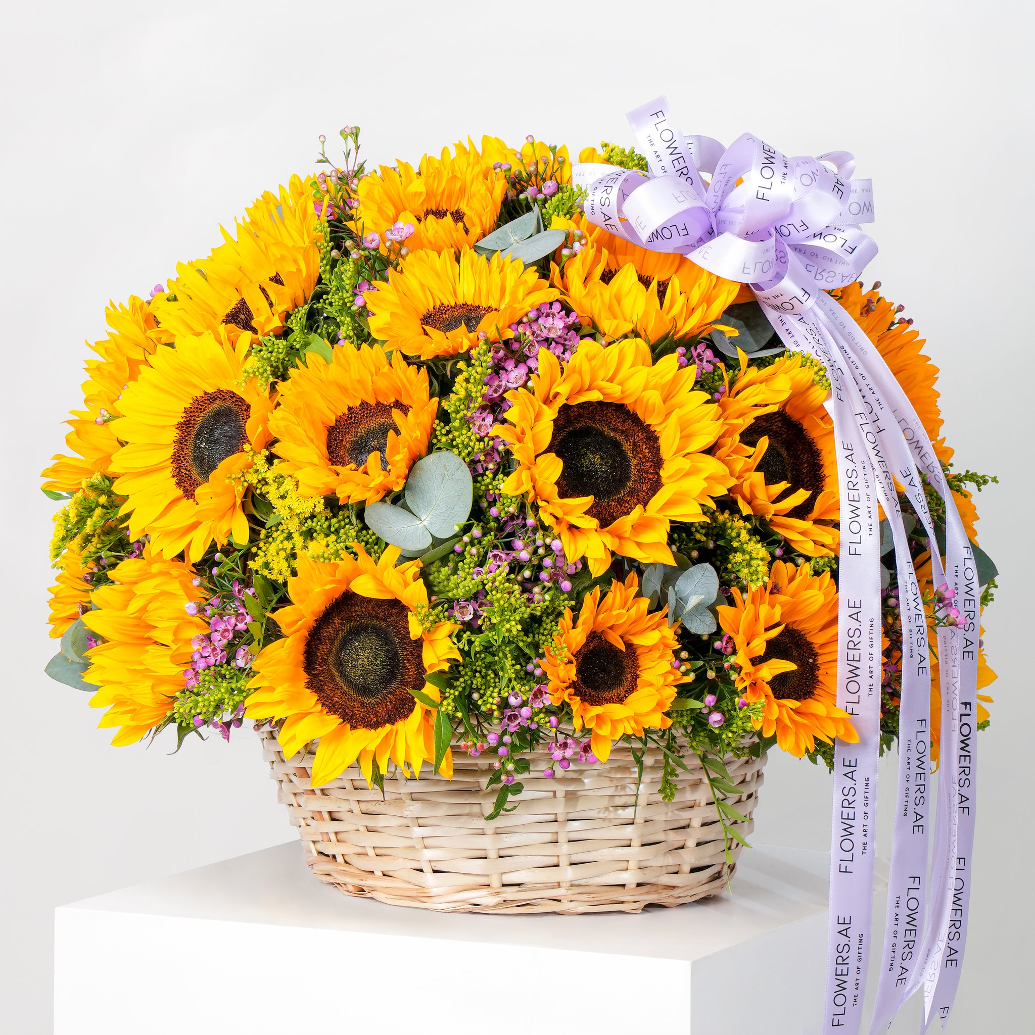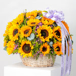 A cheerful burst of sunshine in a hatbox—this arrangement combines radiant sunflowers, golden solidago, and purple wax flowers. Bursting with texture and warmth, it's the perfect floral gift to brighten any moment.