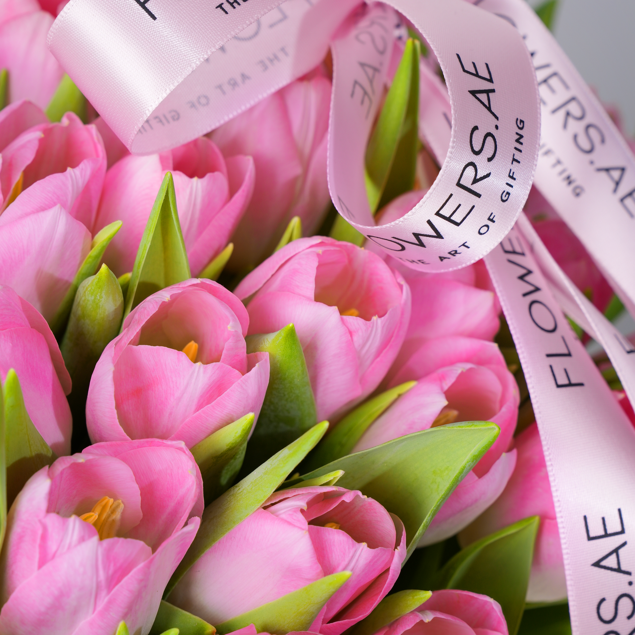 100 Pink Tulips basket arrangement styled for effortless elegance.