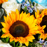 A soft yet striking palette of white roses, sunny sunflowers, and blue oxypetalum, thoughtfully styled in a classic hatbox. A symbol of hope and fresh starts, designed to embrace the sweetness of welcoming a baby.
