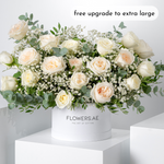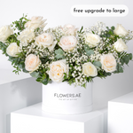 Celebrate a special birthday with this elegant white flower arrangement, featuring Ohara and Vendela roses, pink lilies, and wax flowers. A timeless gift symbolizing love, joy, and new beginnings.