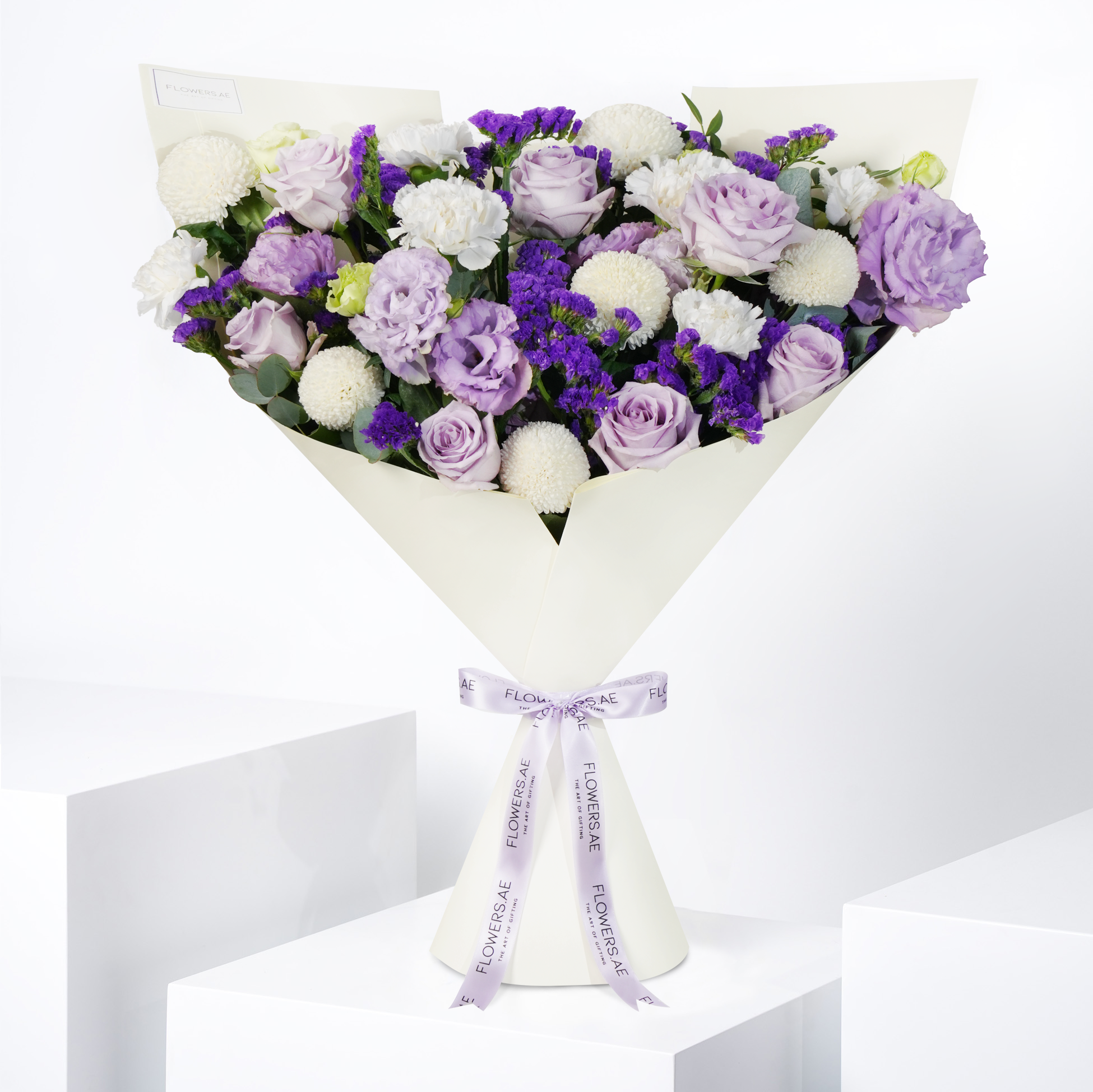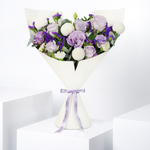 A delicately gathered hand-tied bouquet of frilled purple lisianthus, roses, white carnations, white chrysanthemums ping pong, and touches of purple statice. Ideal for life’s special moments.